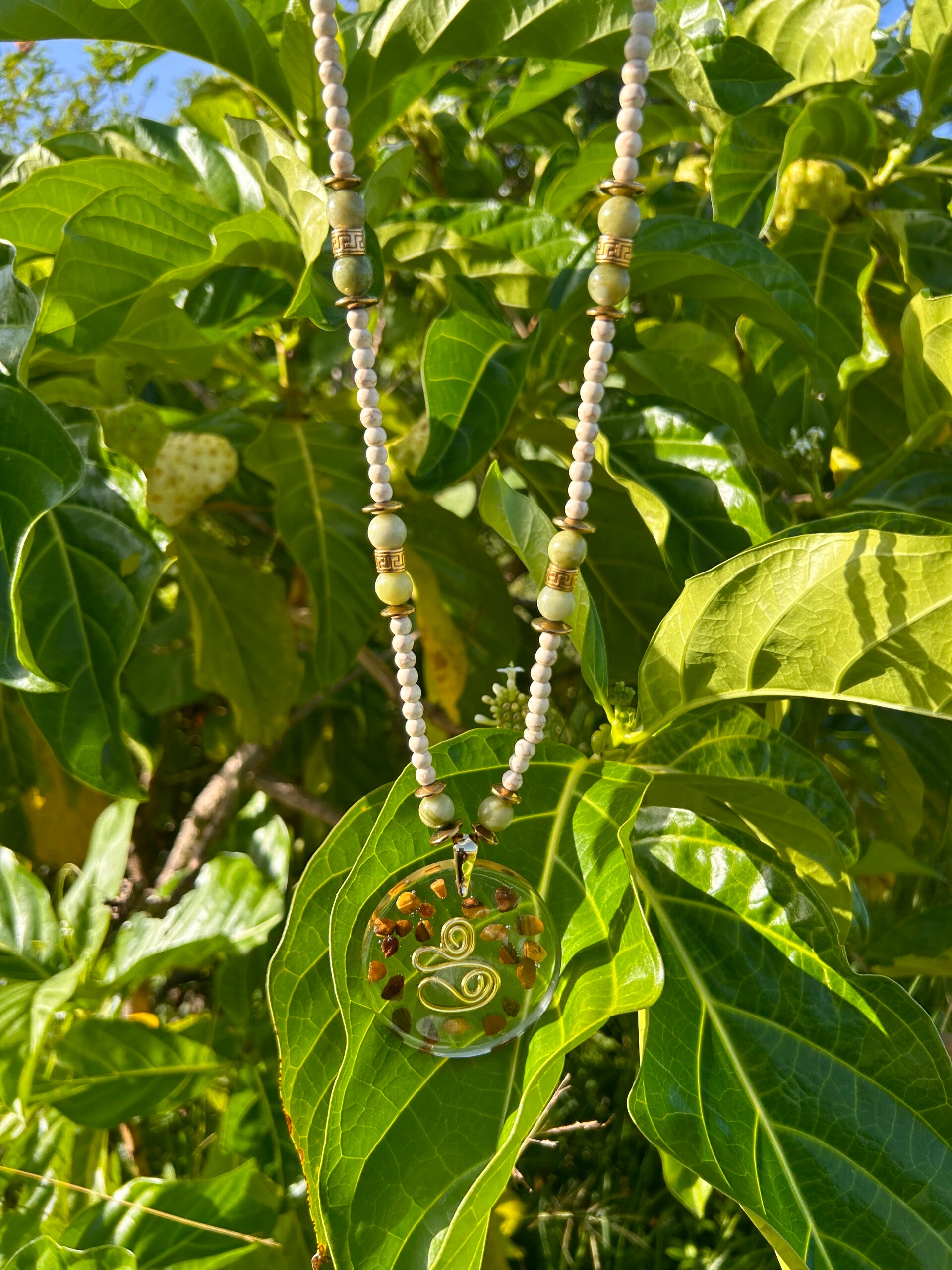 Collier avec des pierres naturelles: Jade verte, magnésite, hématite dorée avec des apprêts en acier inoxydable, et un pendentif en résine avec des minéraux en œil de tigre et du fil d'aluminium.