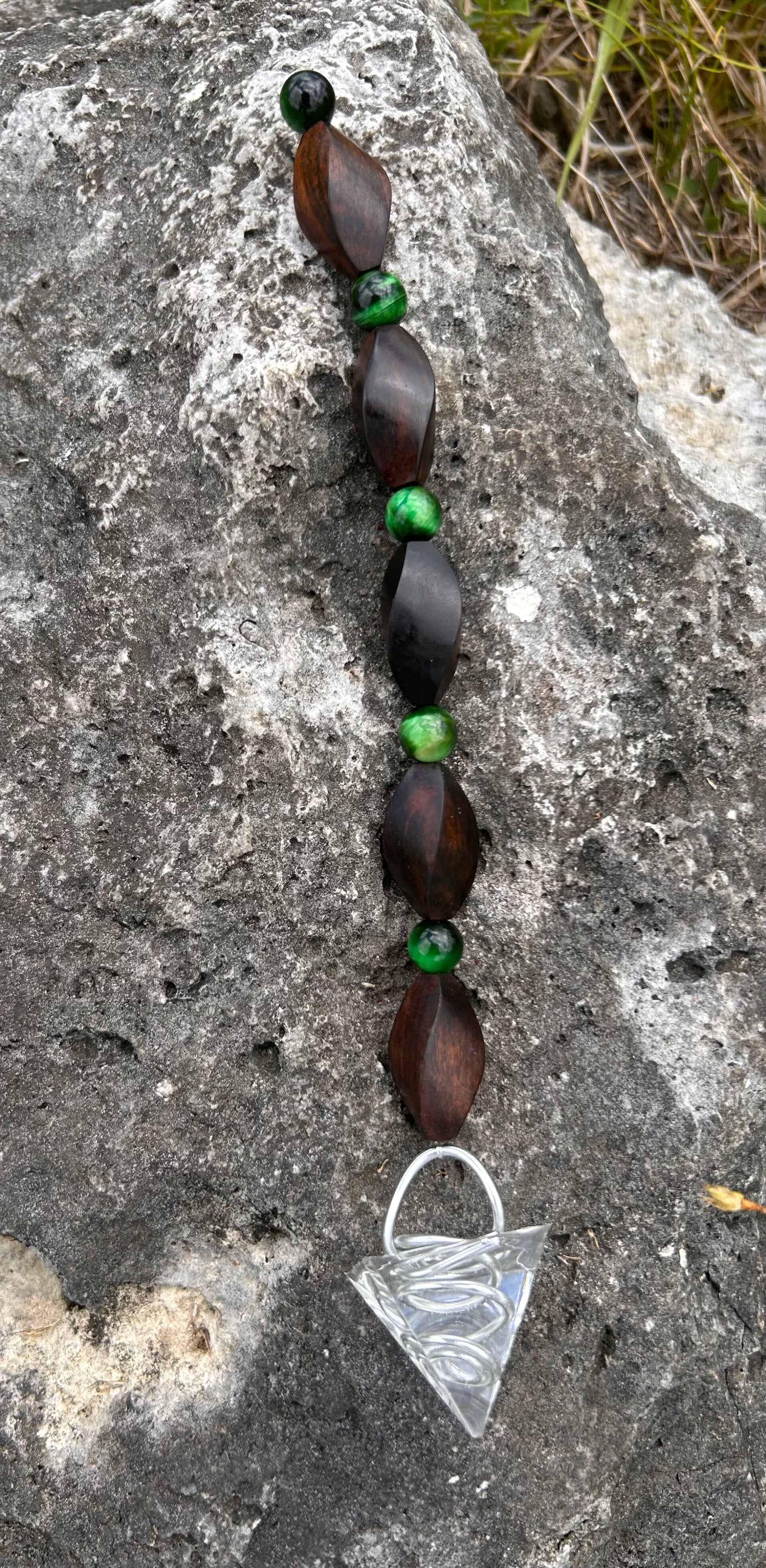 Pendule confectionné par mes soins, avec une pointe en résine avec une spirale en fil d'aluminium incrustée, suspendue à un fil élastique, des perles en oeil tigre teinté vert et du bois d'ébène pour amplifier la puissance du pendule.